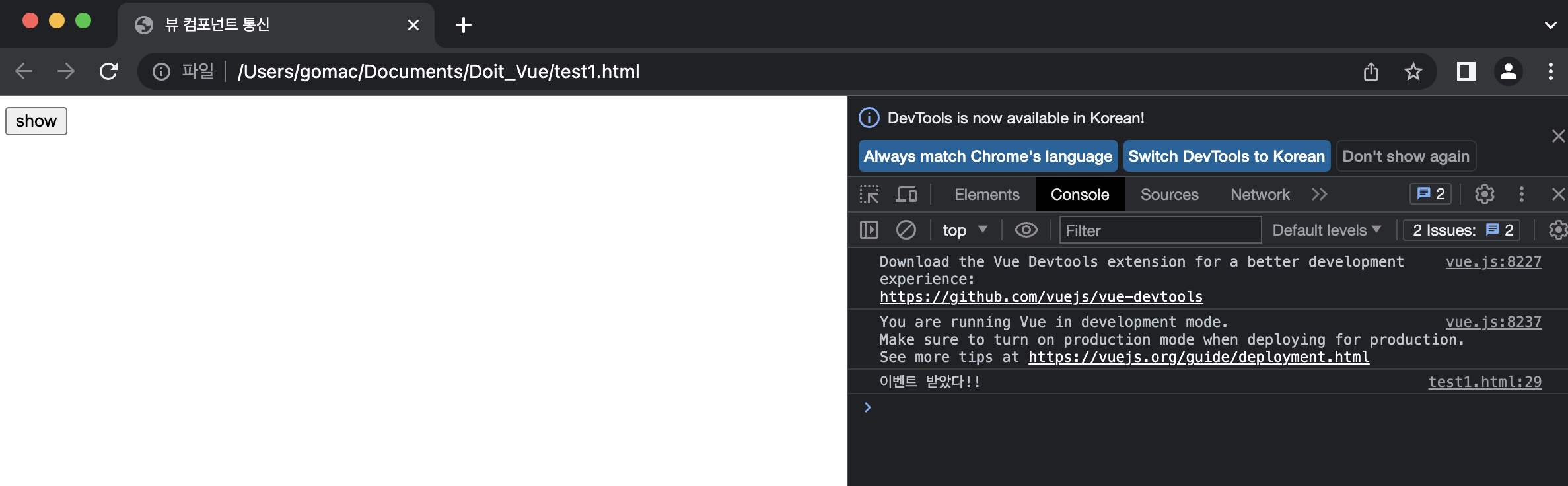 template: '<div>하위 컴포넌트 영역입니다.<button v-on:click="showLog">show</button></div>',